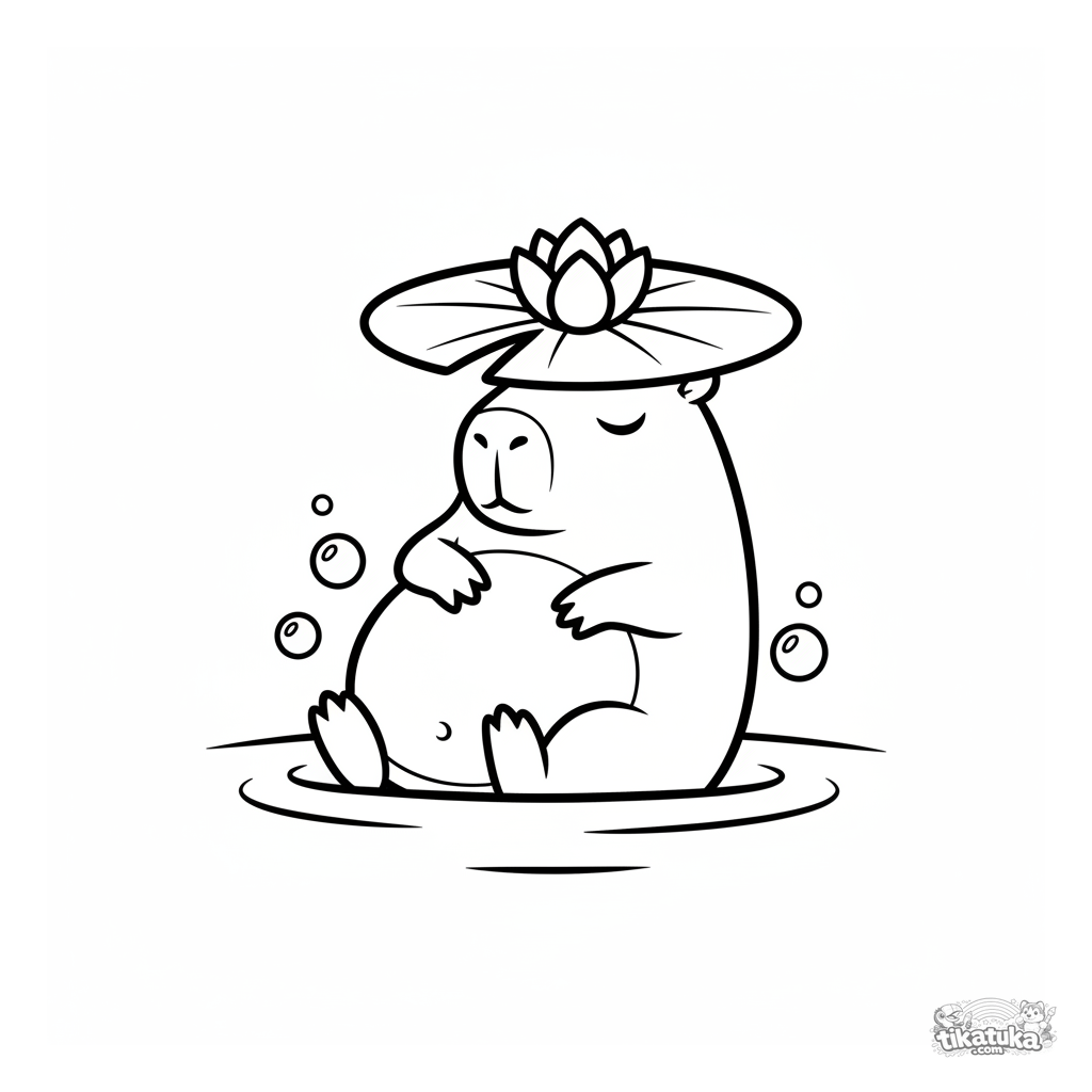 Página para colorir simples para bebês de 2-3 anos: uma capivara relaxada flutuando de costas na água, usando uma ninfeia como chapéu.