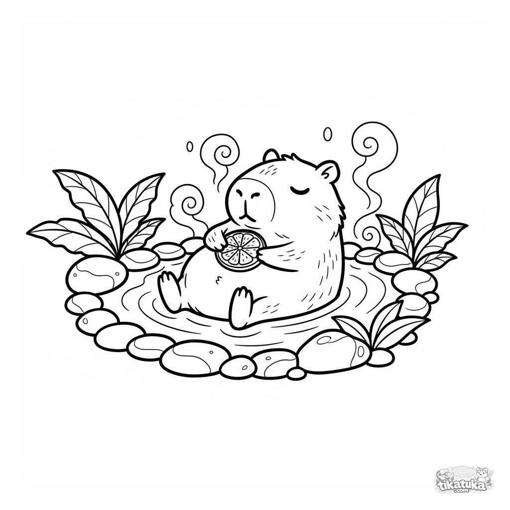 Página detalhada para colorir para crianças maiores 7-12: uma capivara em relaxamento máximo flutua de costas em uma fonte termal, equilibrando uma fatia de laranja na barriga.