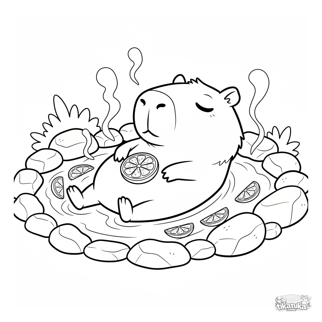 Página para colorir para crianças de 4-6 anos: uma capivara relaxada flutua em uma fonte termal com uma fatia de laranja na barriga.