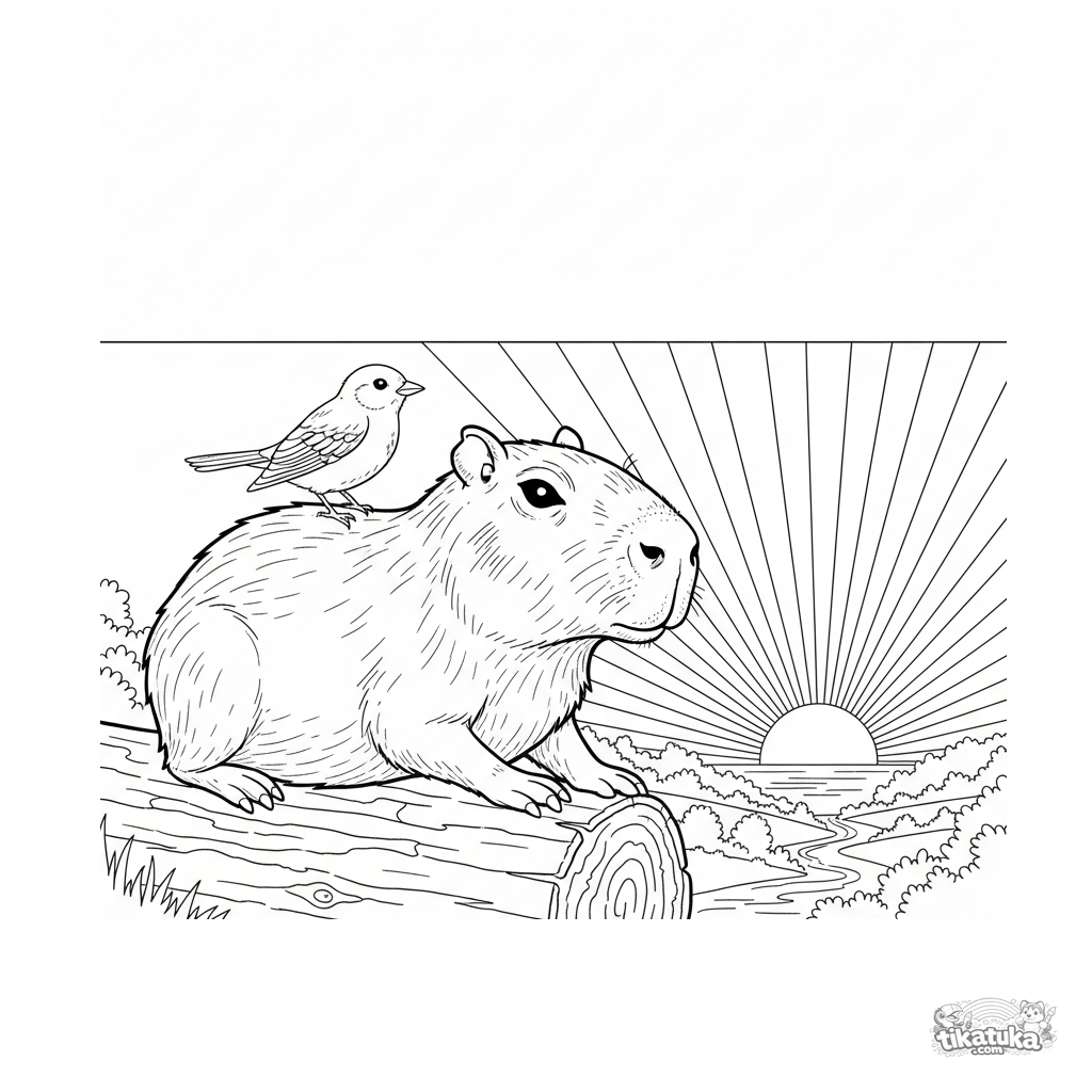 Página para colorir detalhada no estilo de guia de campo para crianças de 10-12 anos: uma capivara e um pássaro em um tronco contemplam o pôr do sol. Cena de amizade silenciosa na natureza.