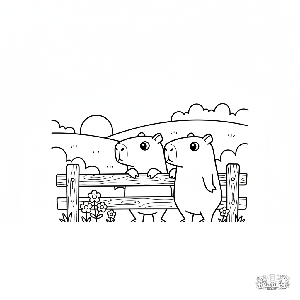 Página para colorir para crianças de 7-9 anos: duas amigas capivaras se encostam em uma cerca, contemplando o pôr do sol.