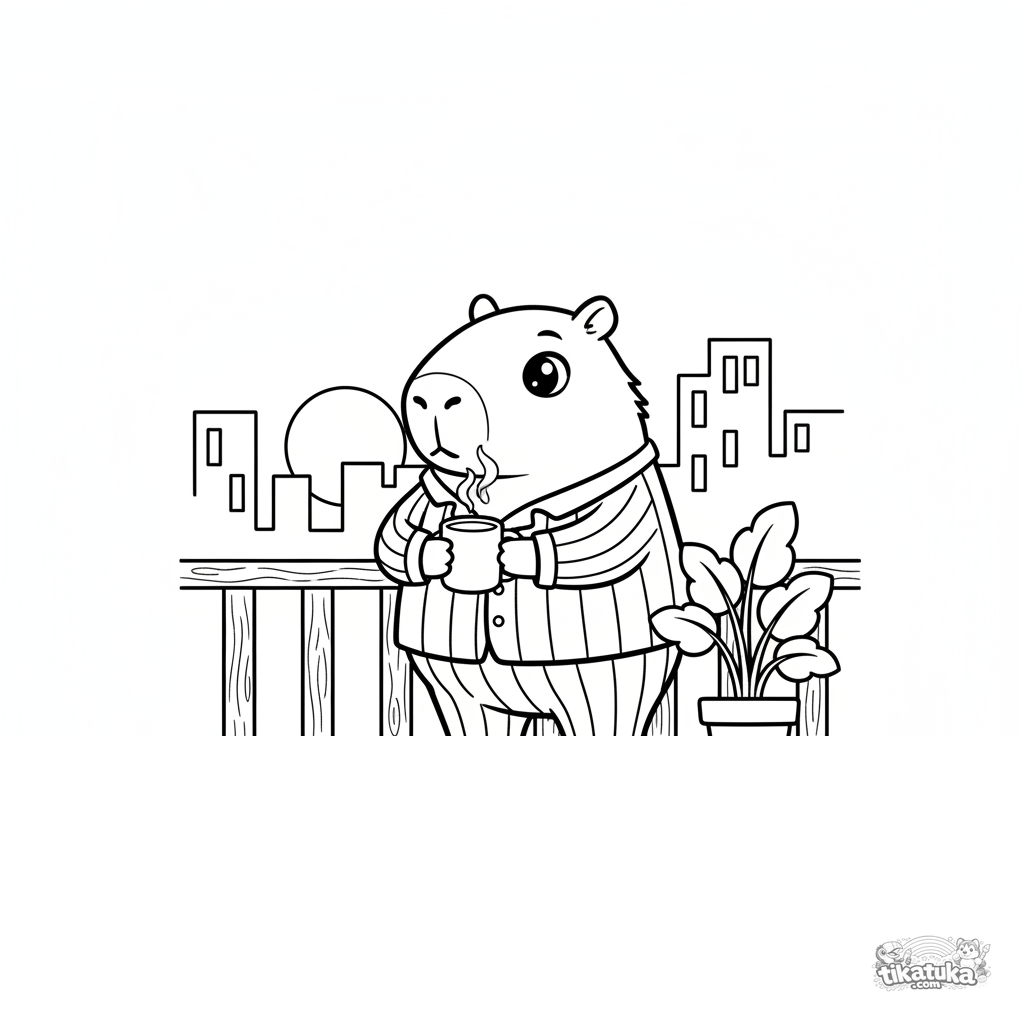 Página para colorir para crianças 7-9: uma capivara aconchegante de pijama com uma caneca na varanda observa o pôr do sol da cidade. Cena de noite calma.