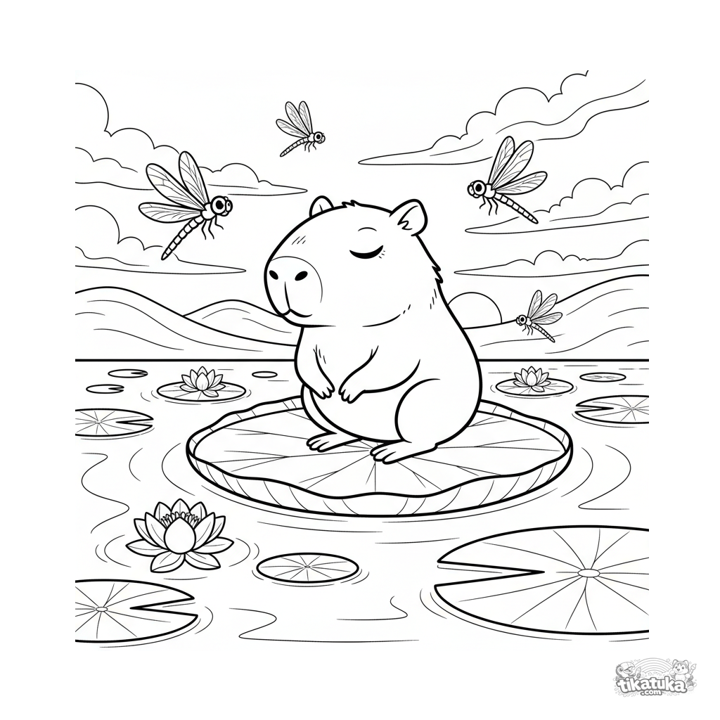 Página para colorir para crianças de 4-6 anos: uma capivara calma meditando em um grande nenúfar em um lago ao pôr do sol.