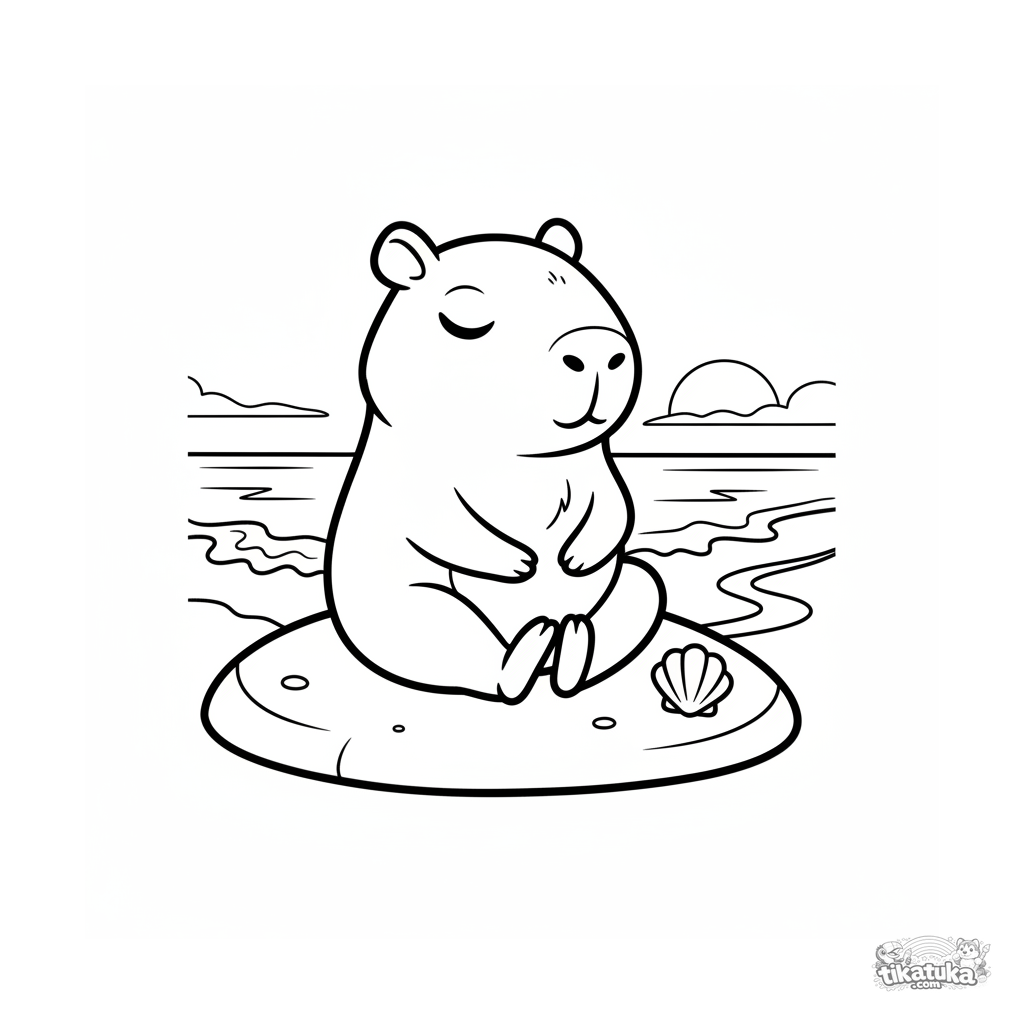 Página para colorir para crianças de 4-6 anos: uma capivara fofa medita em uma pedra à beira-mar ao pôr do sol. Formas simples, cena de paz.