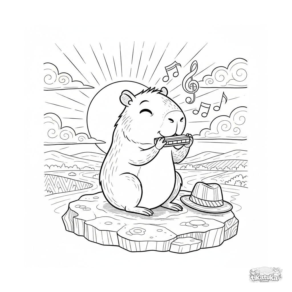 Página complexa para colorir para crianças de 10-12 anos: uma capivara toca gaita em uma rocha ao pôr do sol. Linhas fluidas e notas musicais flutuantes.