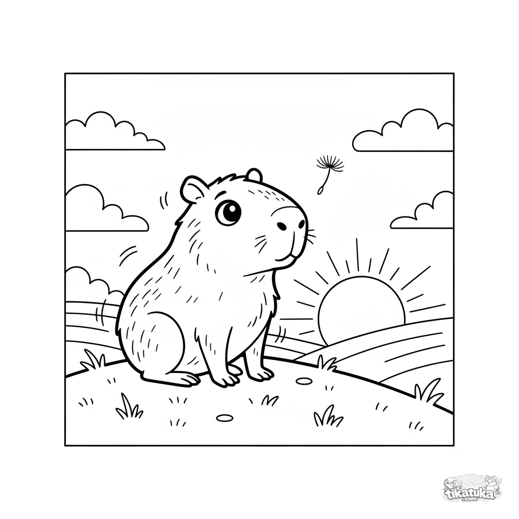 Página para colorir de uma capivara observando o pôr do sol numa colina. Cena de calma e contemplação para crianças de 7 a 9 anos.