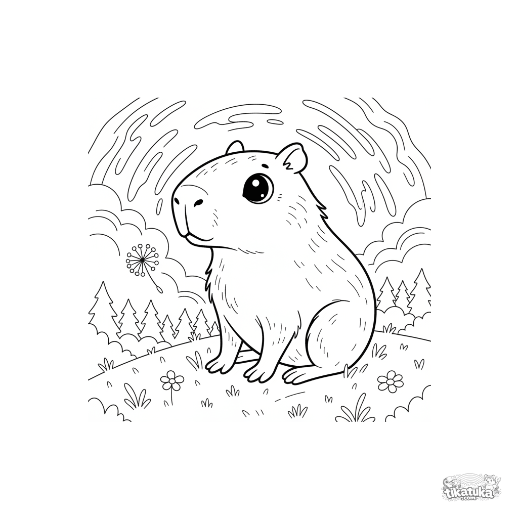 Página para colorir de uma capivara filosófica observando o pôr do sol em uma colina. Para crianças de 7 a 9 anos. Cena de calma e contemplação.