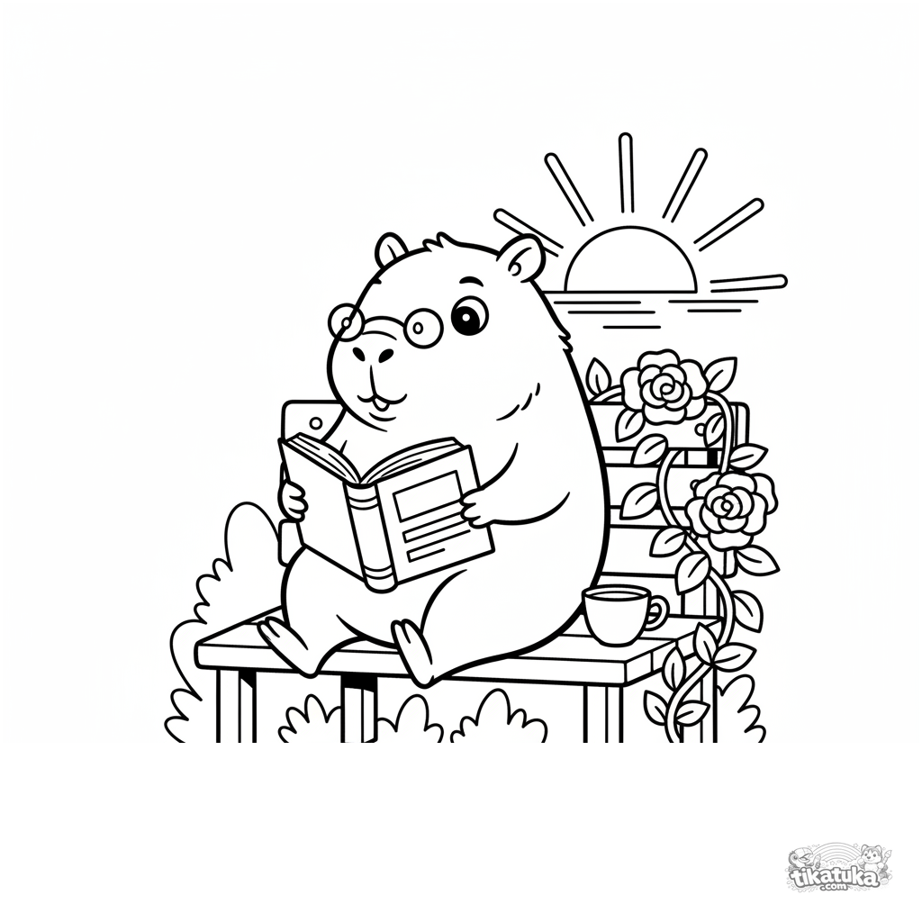 Página para colorir para crianças de 7 a 9 anos: uma capivara com óculos lê um livro em um banco de jardim ao pôr do sol. Cena aconchegante.