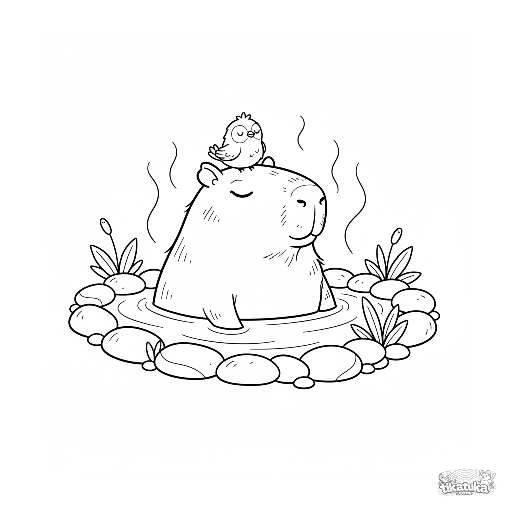 Página para colorir detalhada para crianças de 7 a 12 anos de uma capivara relaxando em uma fonte termal com um pássaro na cabeça.