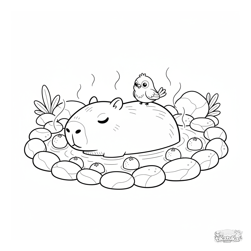 Página para colorir para crianças de 4-6 anos: uma capivara tranquila relaxa em uma fonte termal quente com laranjas flutuando por perto e um passarinho em suas costas.