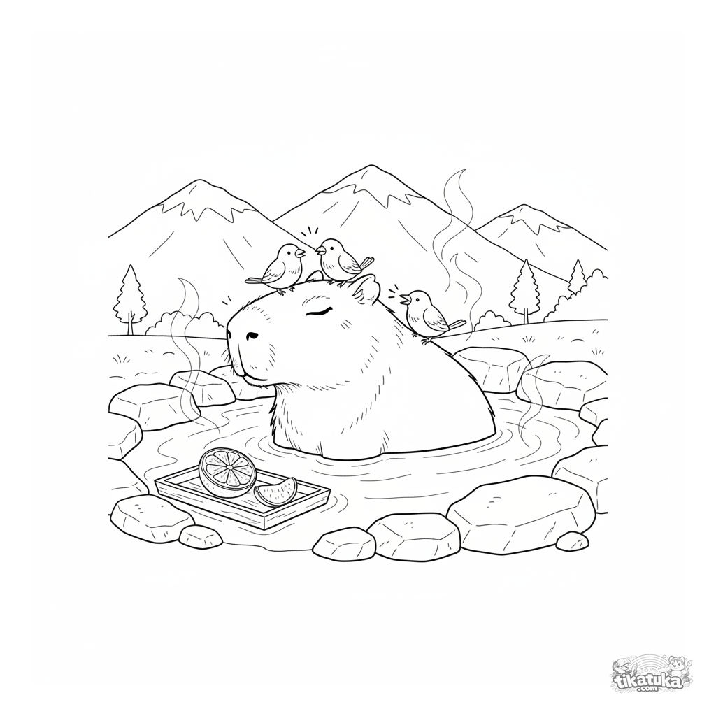 Página para colorir para crianças de 4-6 anos: uma capivara relaxa feliz em uma fonte termal, pequenos pássaros empoleiram-se em suas costas, uma laranja flutua perto em uma bandeja.