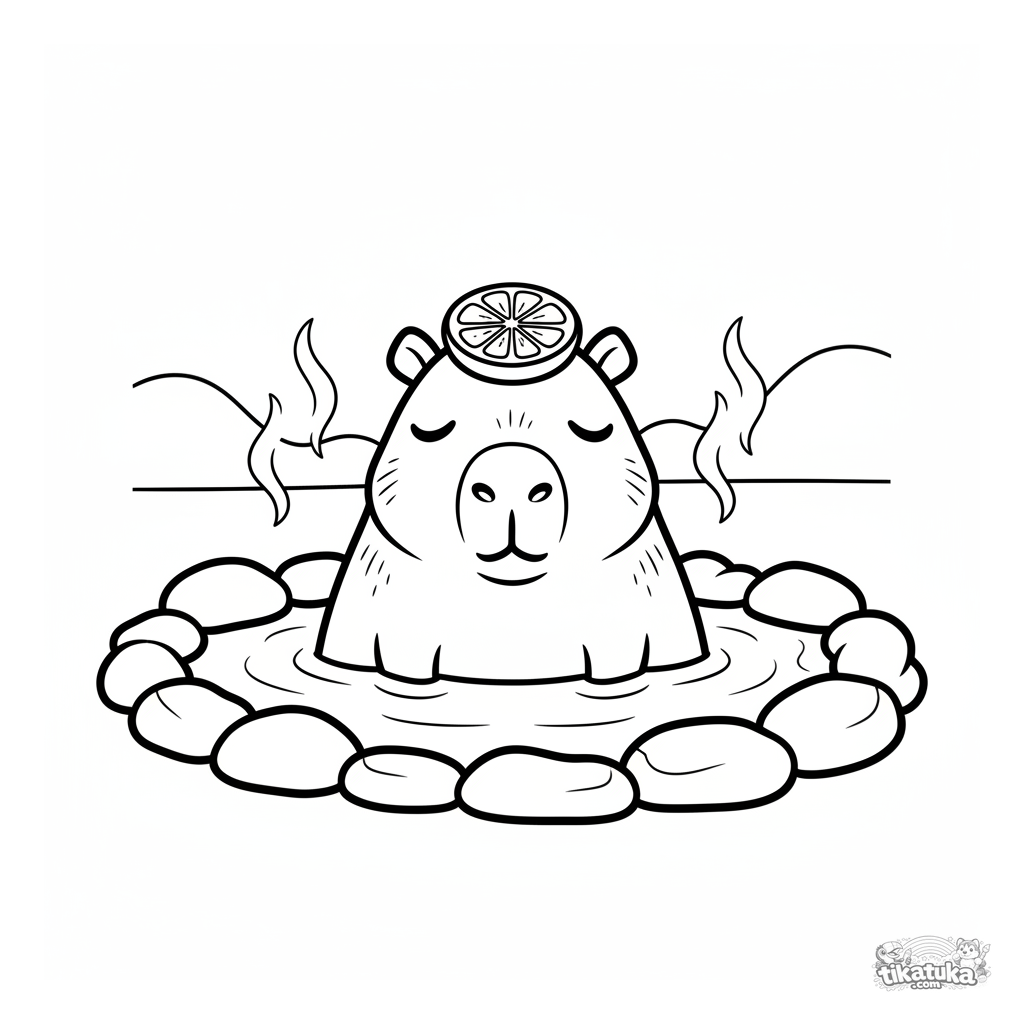 Página para colorir simples para bebês de 2-3 anos com uma capivara muito relaxada em uma fonte termal com uma fatia de laranja na cabeça.