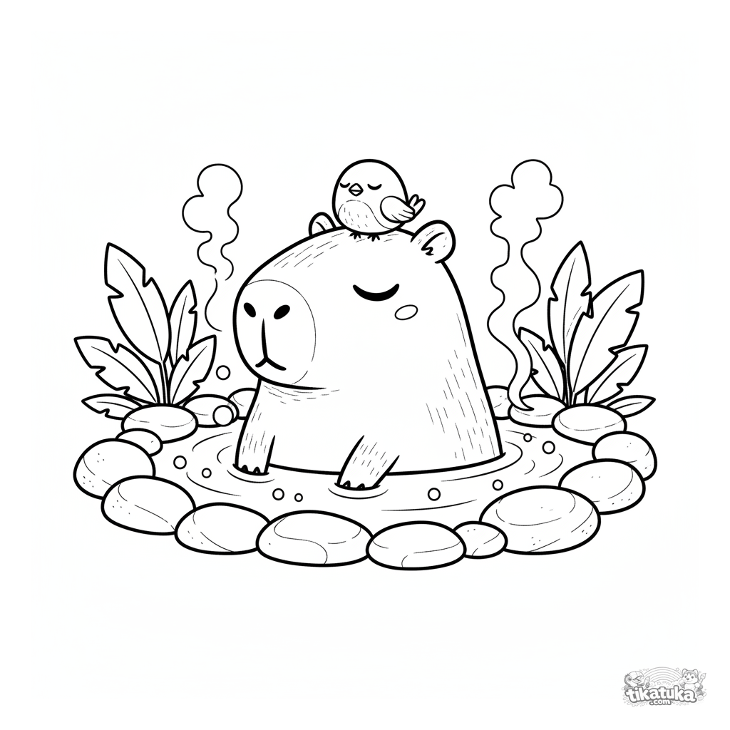 Página para colorir 'relaxante': uma capivara em fonte termal com um pássaro na cabeça. Cena pacífica e serena.