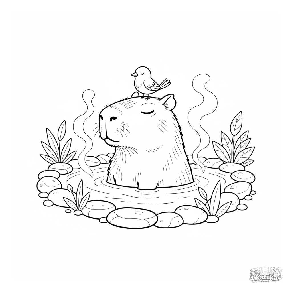 Página para colorir calma para crianças: uma capivara relaxa em uma fonte termal com um passarinho em sua cabeça. Cena pacífica com detalhes naturais.