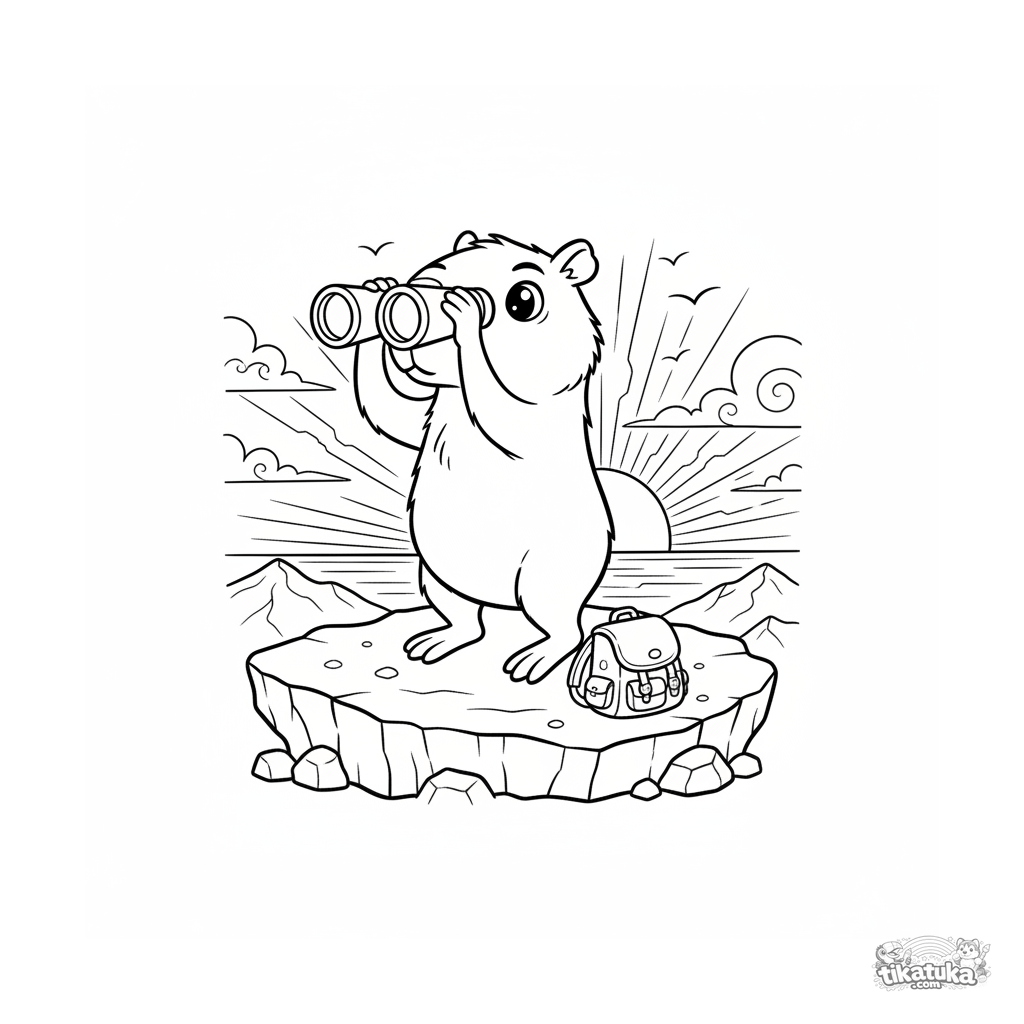Página para colorir para crianças de 4-6 anos: uma capivara curiosa em pé em uma rocha observando o pôr do sol com binóculos. Cena dinâmica e clara.