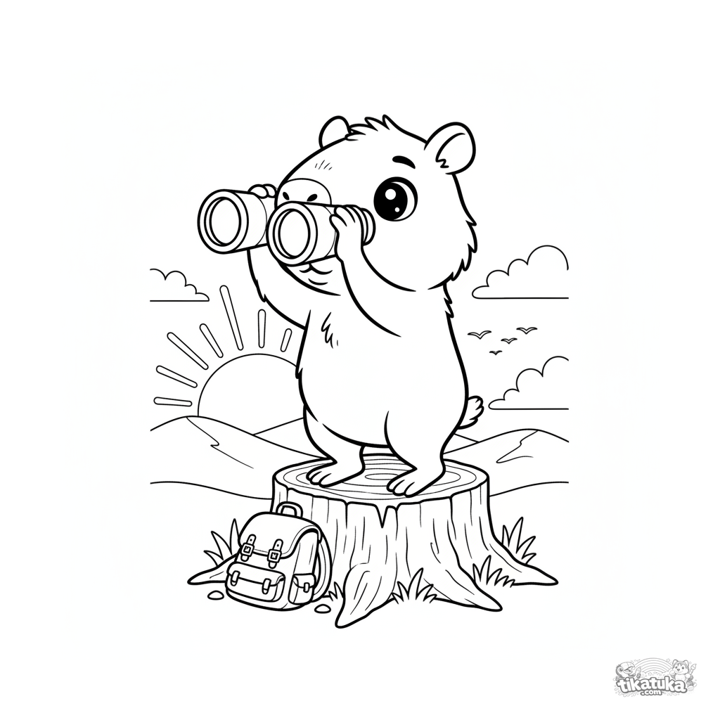 Página para colorir para crianças de 4-6 anos: uma capivara curiosa em pé em um toco observando o pôr do sol com binóculos. Pose dinâmica, formas claras.