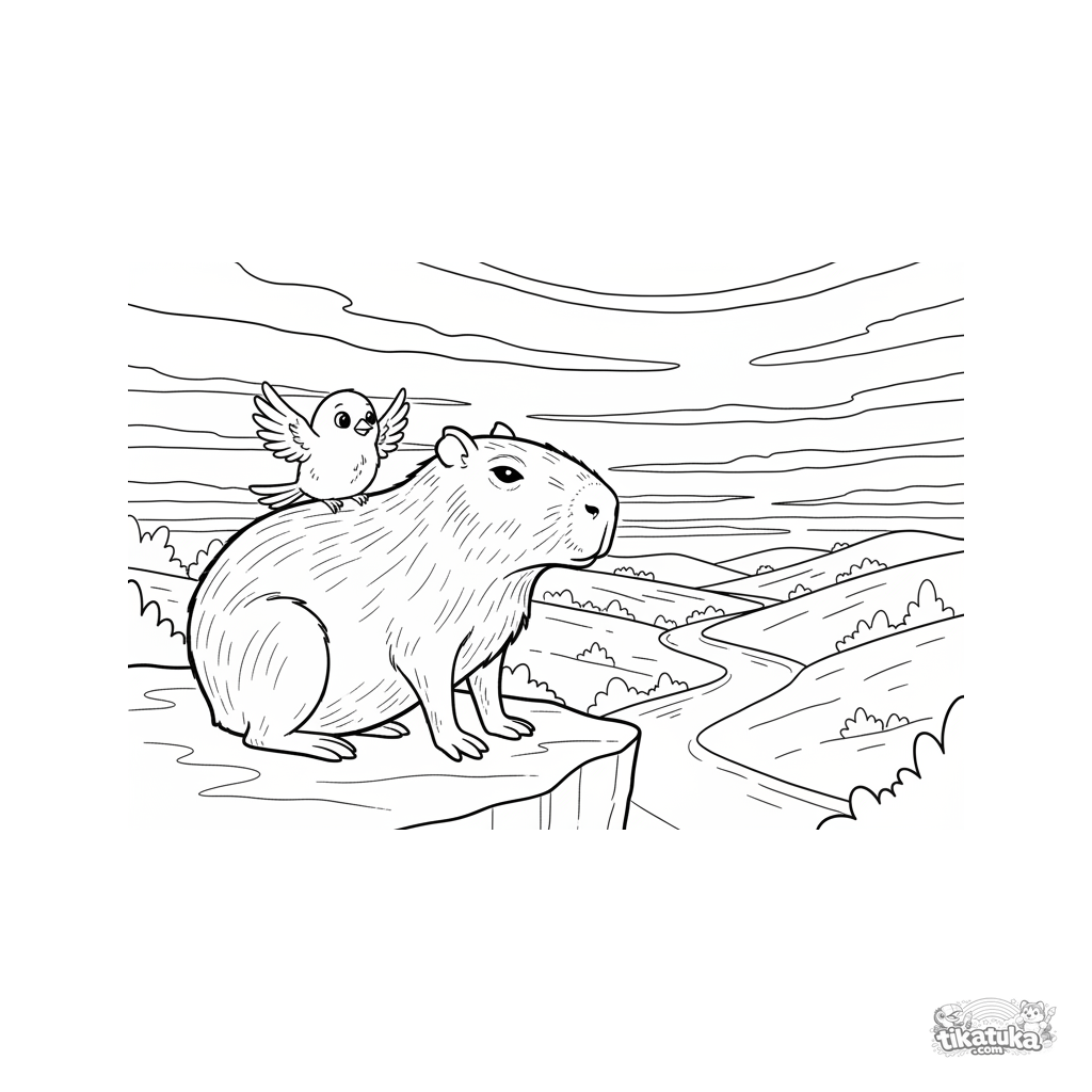 Página para colorir para crianças 7-9: uma capivara e um passarinho sentados numa pedra, contemplando o pôr do sol sobre um vale. Comovente cena de amizade silenciosa e paz.