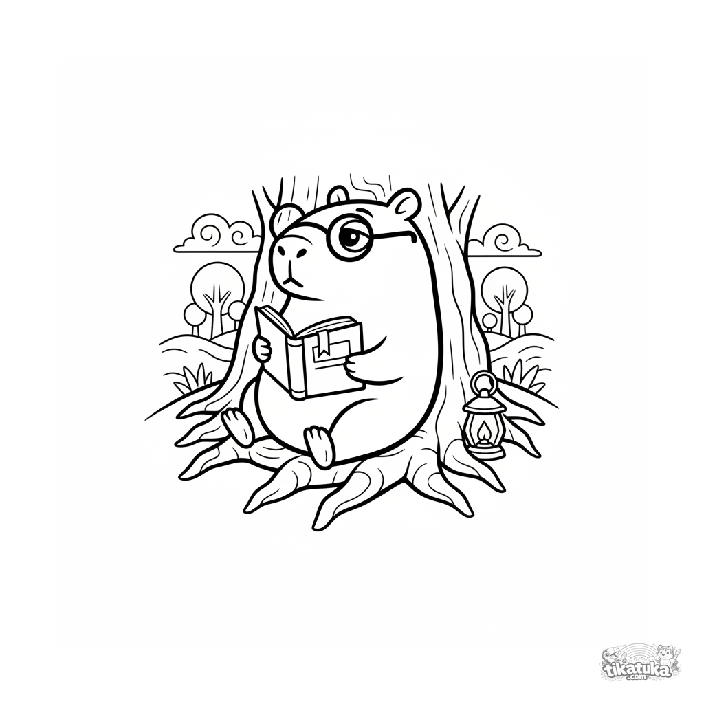 Página para colorir: uma capivara de óculos lê um livro num cantinho aconchegante mas se distrai com o belo pôr do sol. Estilo brinquedo de madeira para 4-6 anos.