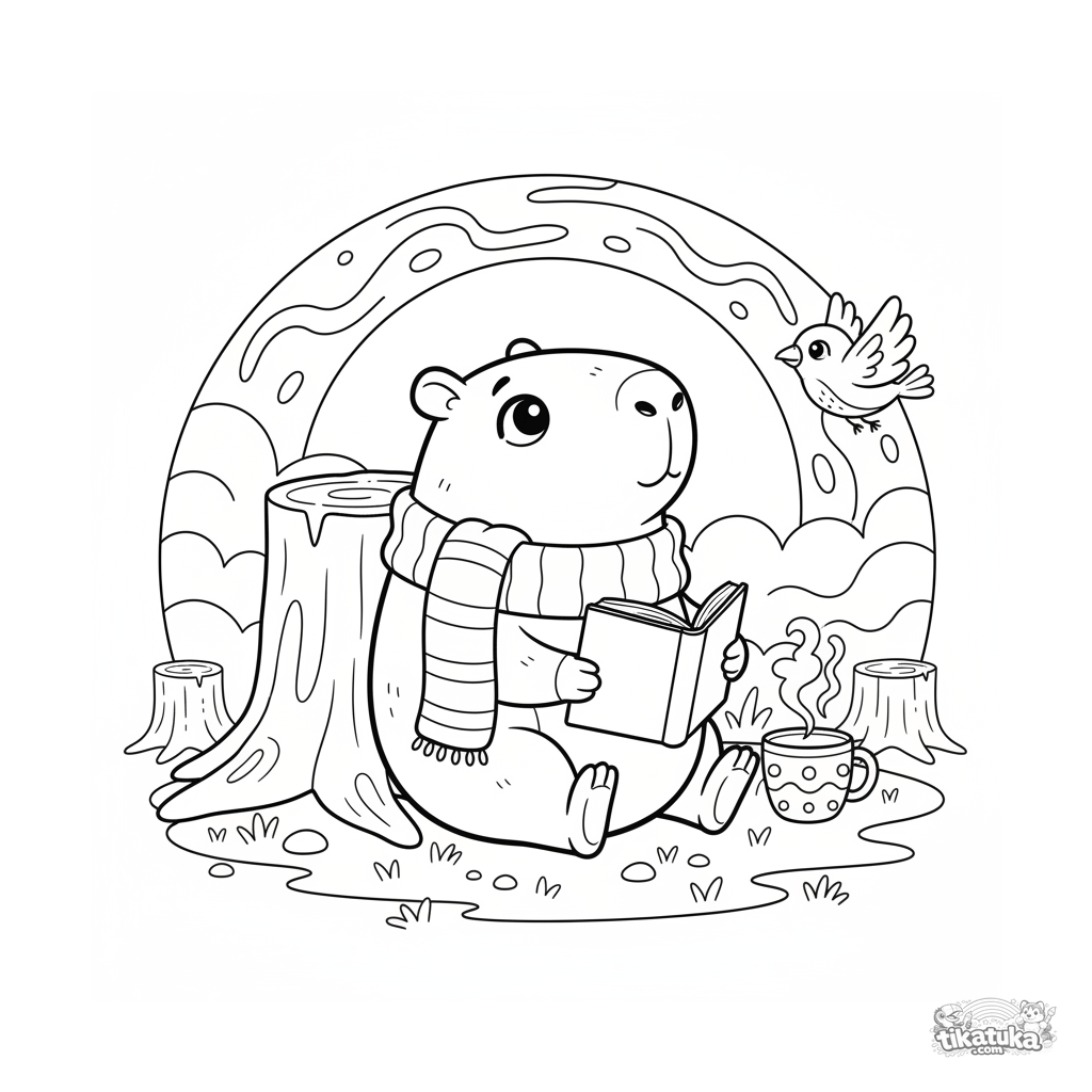 Página para colorir para crianças 4-6: uma capivara aconchegante com cachecol lê um livro, mas se distrai com um belo pôr do sol. Cena simples e fofa.