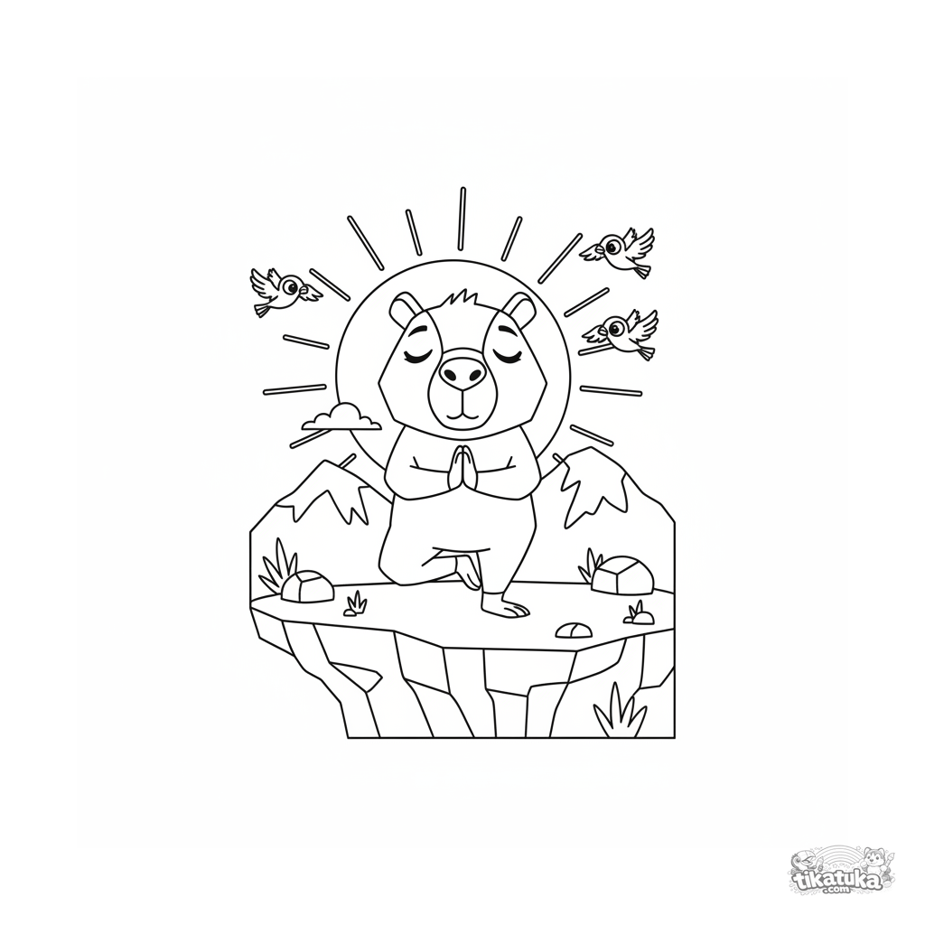 Página para colorir para crianças 4-6: uma capivara em pose de yoga numa saliência montanhosa, meditando enquanto observa o pôr do sol. Cena divertida e calmante.