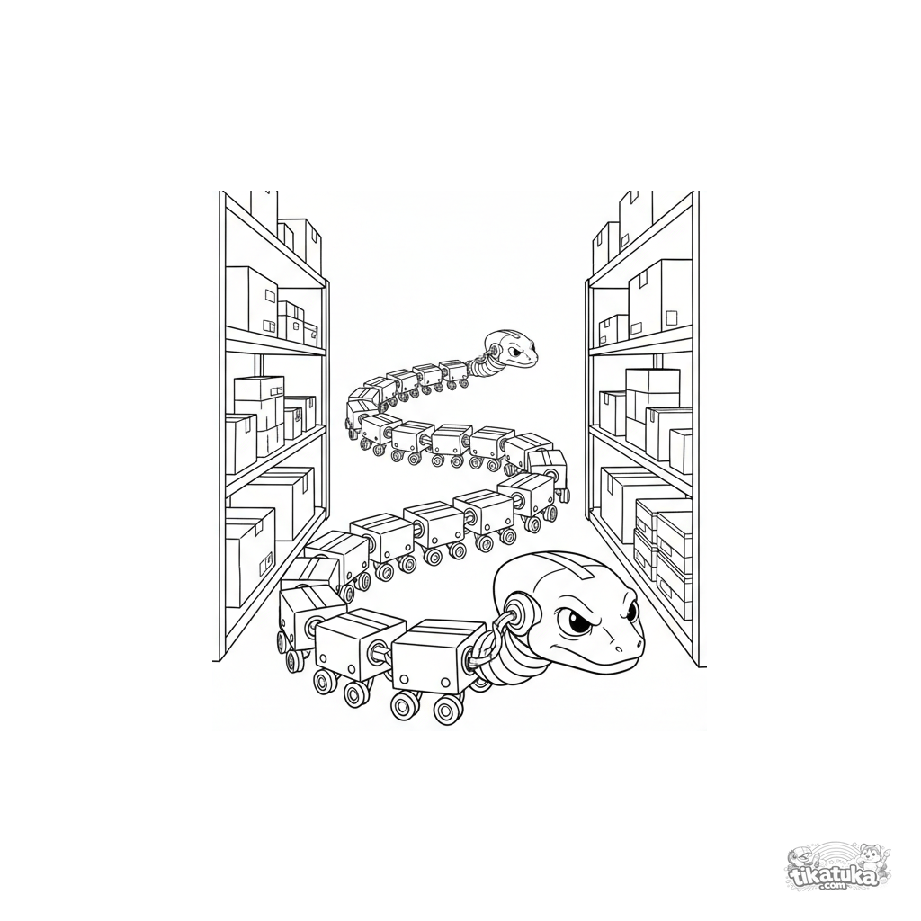 Página para colorir para crianças de 4-6 anos: um robô longo e segmentado em forma de cobra transporta carga por um corredor estreito. Linhas limpas, estilo de guia de campo, formas claras.