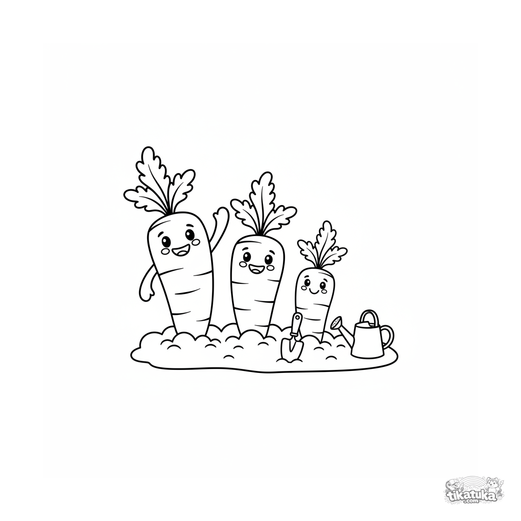 Página para colorir para crianças 4-6: três cenouras felizes de tamanhos diferentes crescendo em um canteiro. Rostos fofos, cena simples com regador e pá de jardim, margens amplas.