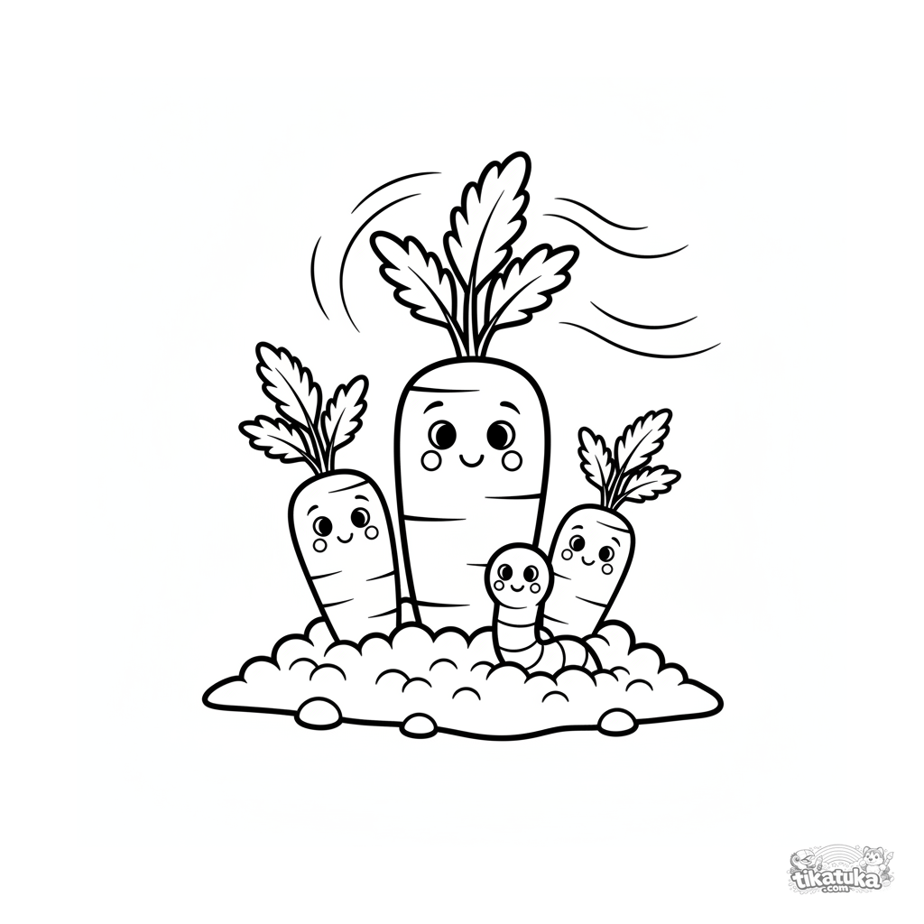Página simples para colorir para bebês 2-3: uma família de cenouras no solo. Formas grandes, rostos fofos, poucos detalhes.