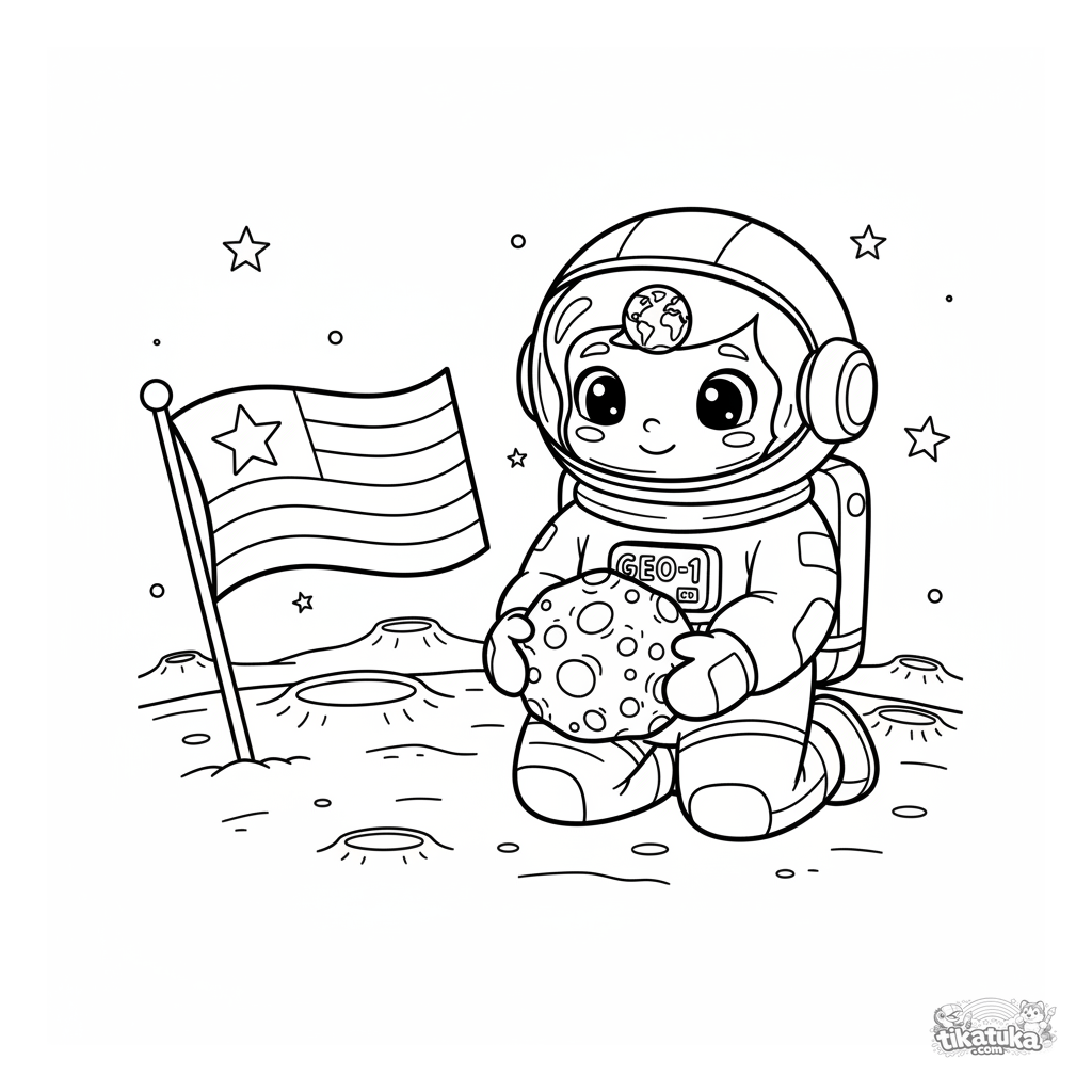 Página para colorir com tema espacial: um astronauta geólogo examina uma amostra de rocha lunar na superfície da lua. Para crianças de 5 a 8 anos. Detalhes do traje espacial, paisagem lunar e estrelas.