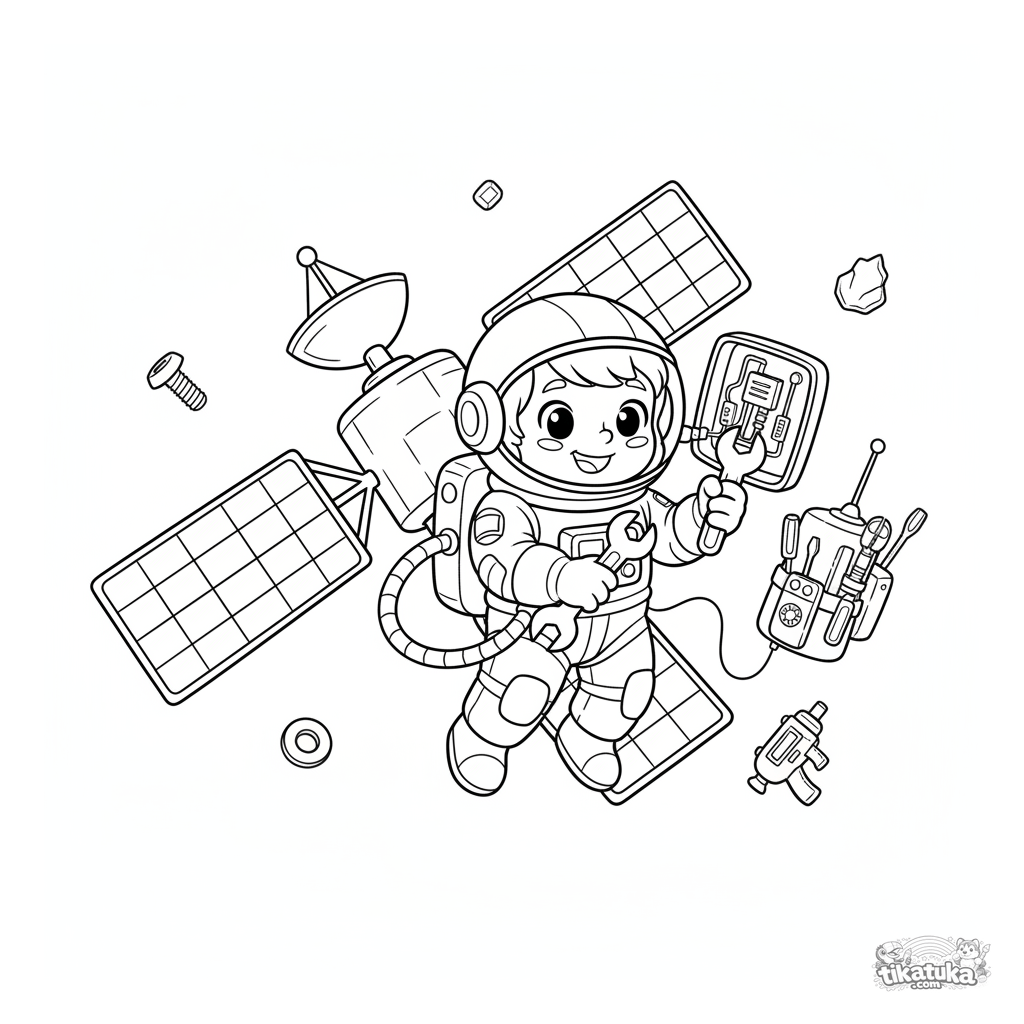 Página para colorir de um astronauta no espaço sideral, consertando um satélite com ferramentas. Para crianças de 5 a 8 anos. Fundo branco simples para colorir.