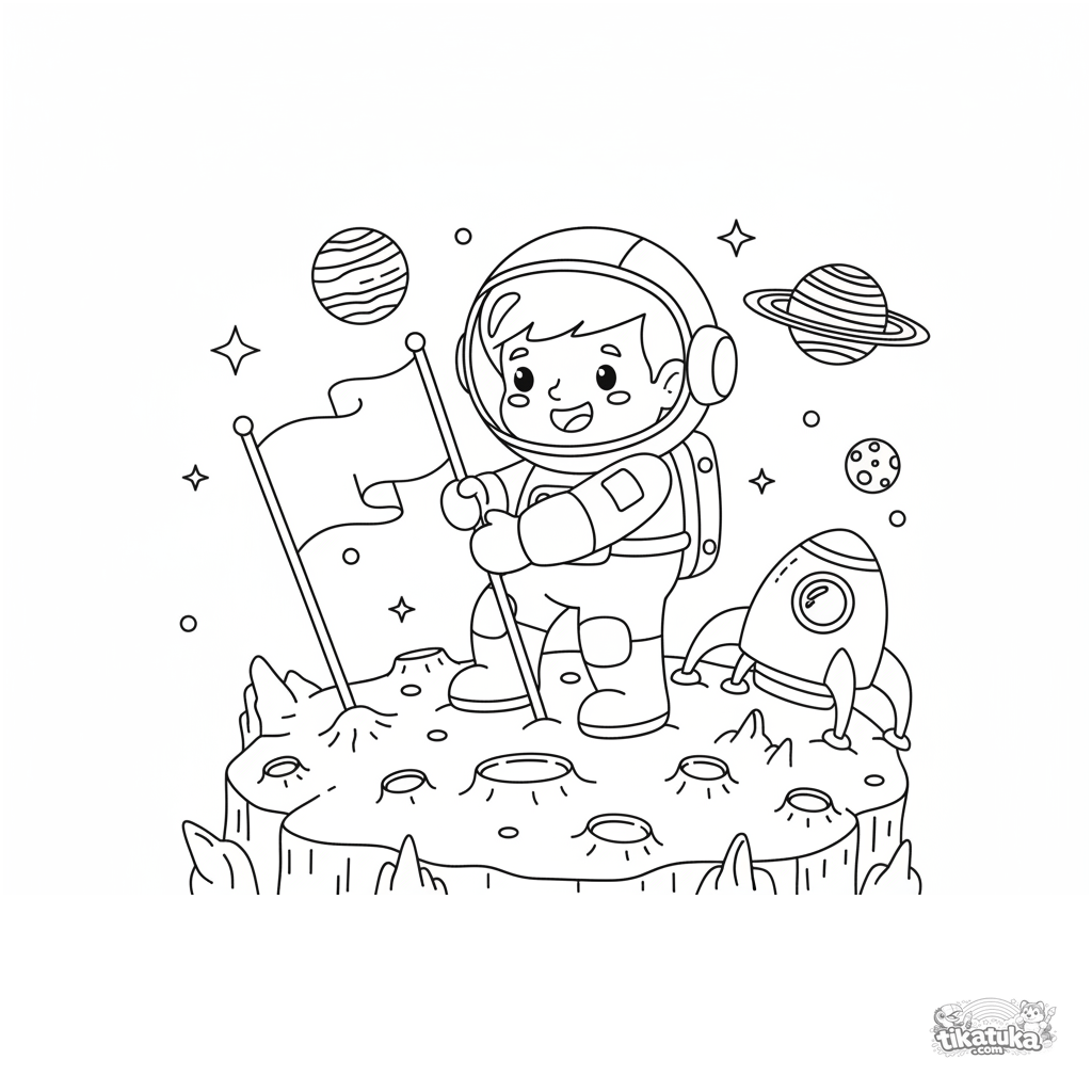 Página para colorir de um astronauta plantando uma bandeira em um asteroide no espaço. Para crianças de 5 a 8 anos. Cena com nave espacial e planetas.