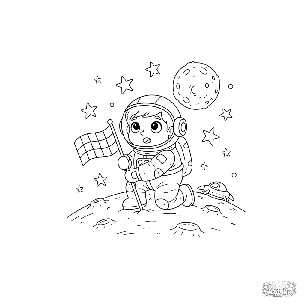 Página para colorir do espaço com um astronauta plantando uma bandeira em um planeta anelado. Cena cósmica simples para crianças de 4 a 6 anos.