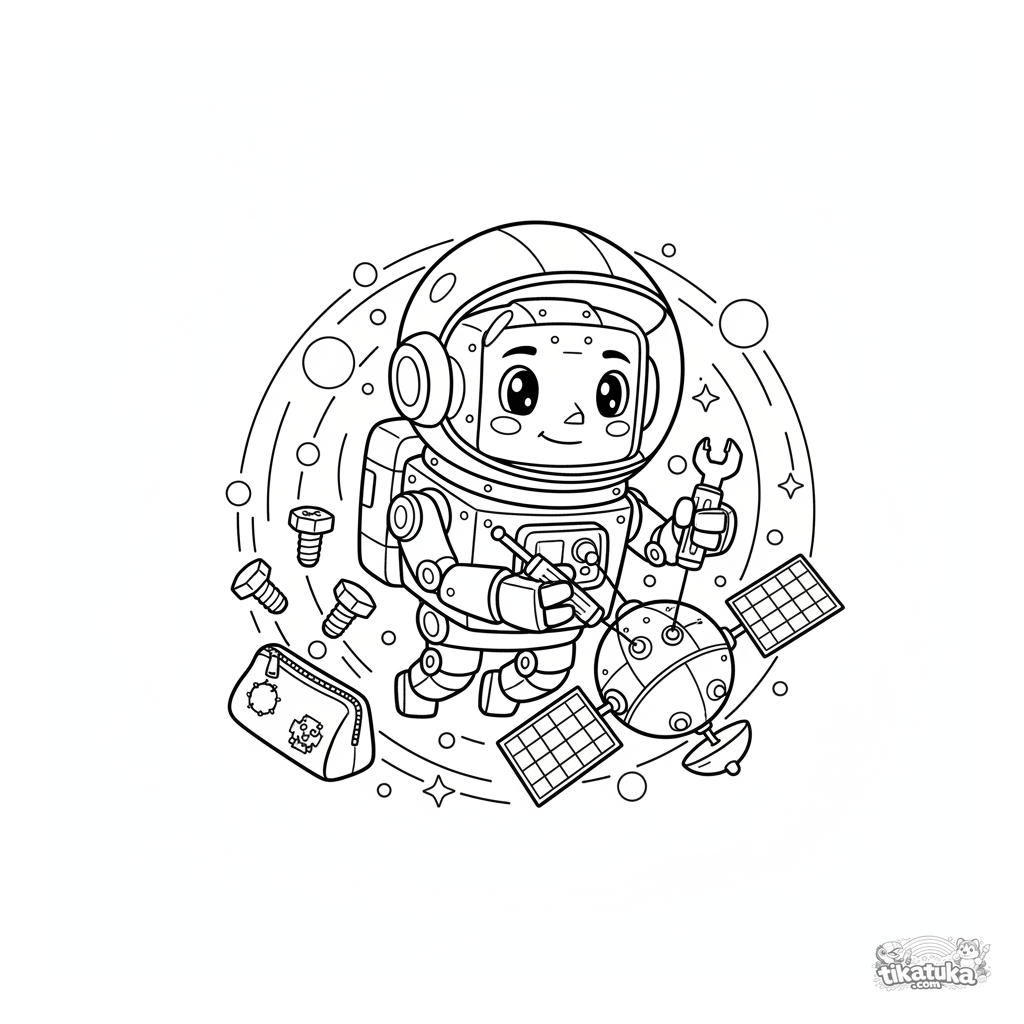 Página para colorir de um robô astronauta amigável consertando um satélite no espaço sideral. Para crianças de 5 a 8 anos.
