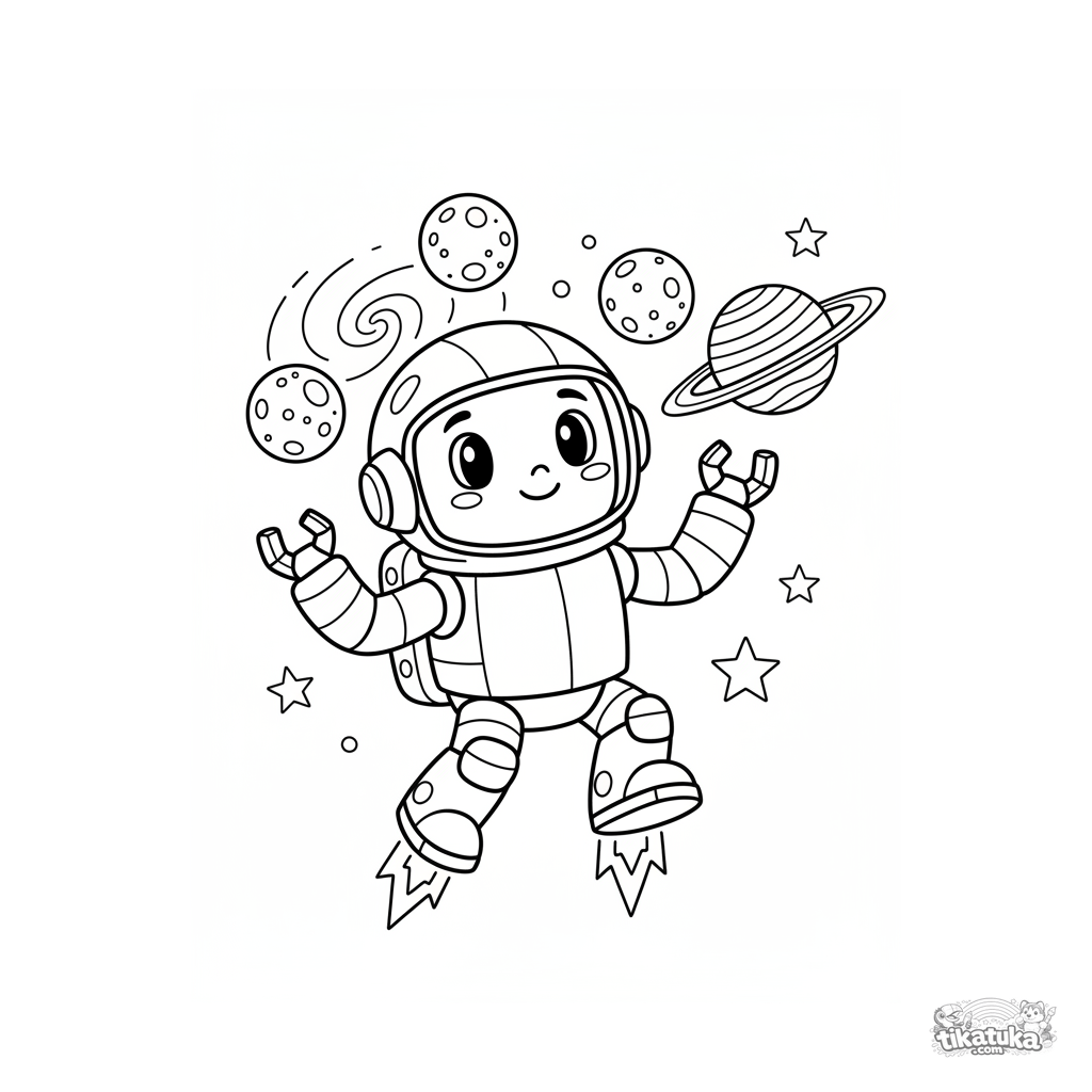 Página para colorir de um robô astronauta amigável fazendo malabarismo com luas pequenas no espaço perto de um planeta anelado. Para crianças de 5 a 8 anos. Uma cena espacial divertida em fundo branco.