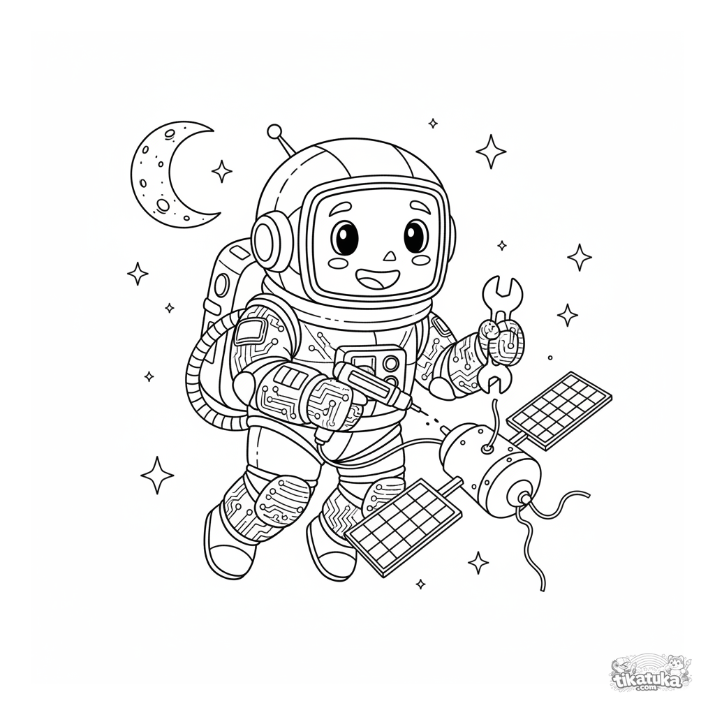 Página para colorir de um robô astronauta consertando um satélite no espaço sideral. Para crianças de 8 a 12 anos. Cena complexa e detalhada com planetas e ferramentas.