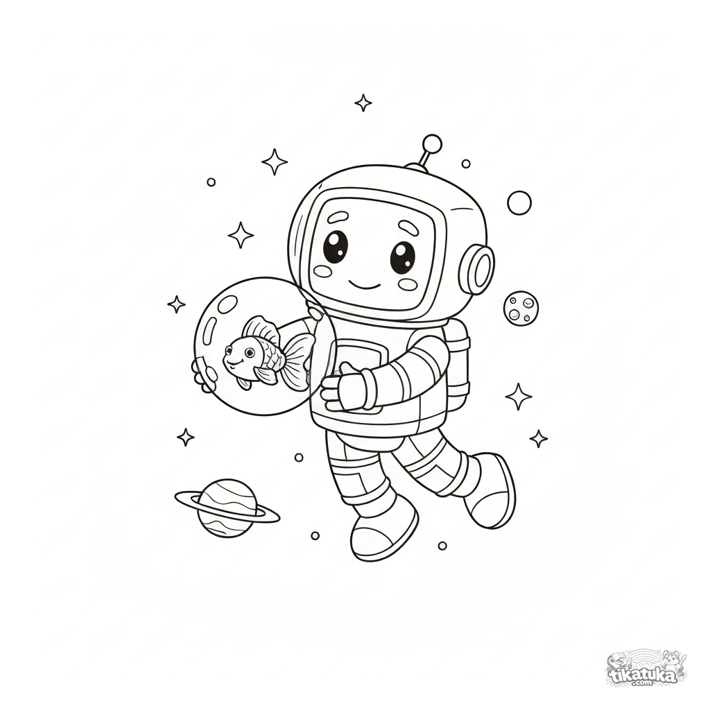 Página difícil para colorir: um robô astronauta no espaço com um peixe dourado numa bolha. Para crianças de 8 a 12 anos. Planetas e estrelas delineados.