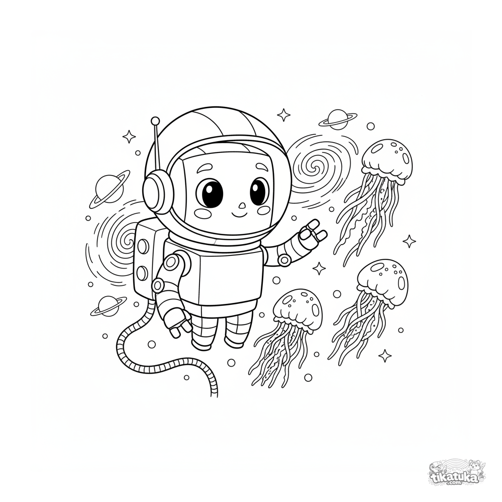 Página para colorir espacial de um robô astronauta encontrando águas-vivas espaciais brilhantes entre estrelas e nebulosas. Para crianças de 5 a 8 anos.