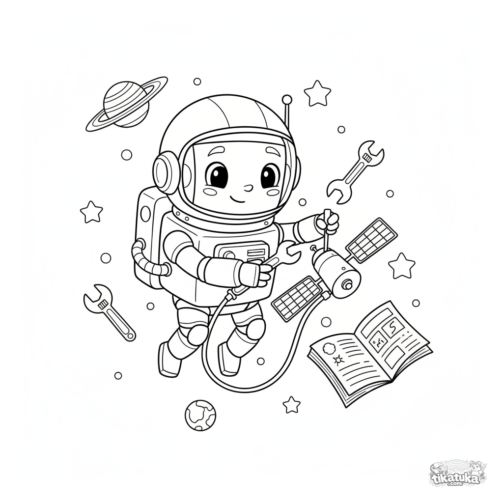 Página para colorir difícil: um robô em traje espacial repara um satélite no espaço sideral. Para crianças de 8 a 12 anos. Cena com um cabo, ferramentas e planetas delineados ao fundo.