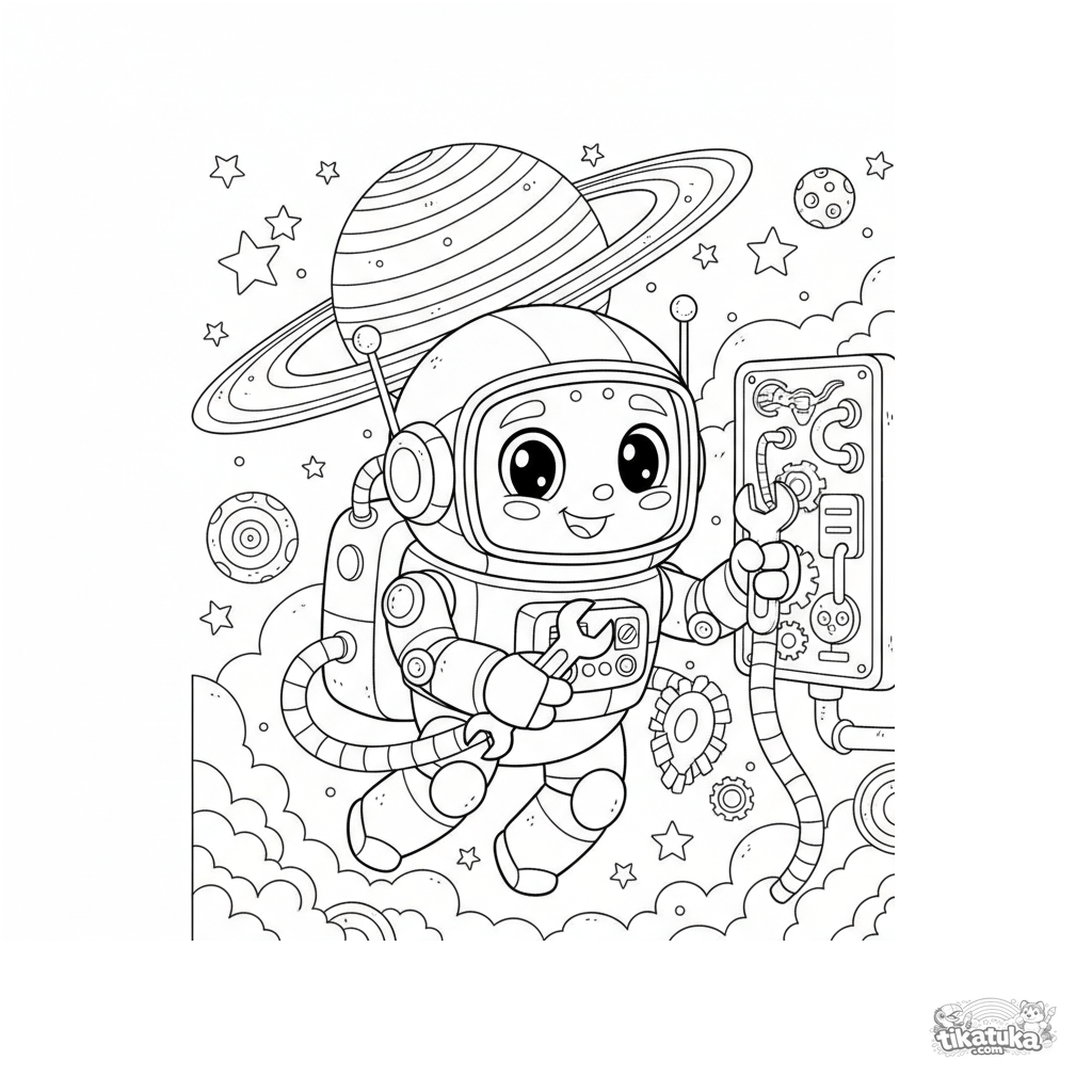 Página para colorir de um robô astronauta amigável fazendo reparos no espaço perto de um planeta anelado. Para crianças maiores de 7 a 12 anos.