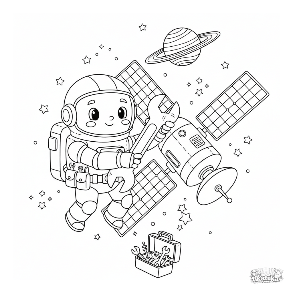 Página para colorir espacial de um robô astronauta amigável consertando um satélite em órbita. Para crianças de 8 a 12 anos.