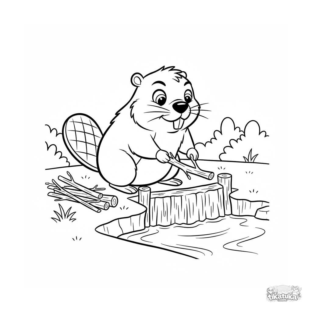 Página para colorir para crianças 4-6: um castor de desenho animado trabalhador está construindo uma pequena represa de gravetos em um riacho. Cena divertida e educativa da vida animal.