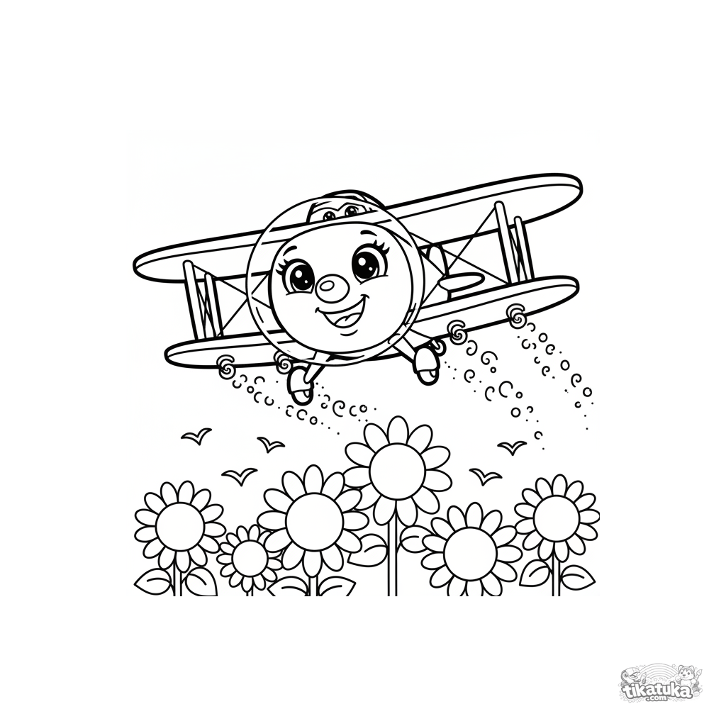 Página simples para colorir de um biplano agrícola alegre com rosto sorridente, voando sobre um campo de girassóis. Formas grandes para bebês de 2-3 anos.