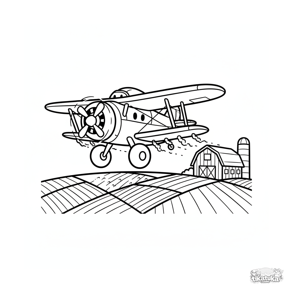 Página para colorir de um avião agrícola de desenho animado voando baixo sobre campos de fazenda. Para crianças de 7 a 9 anos. Design brilhante, cena rural reconhecível.