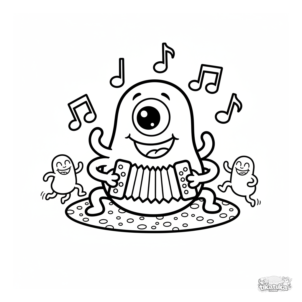 Página simples para colorir para crianças pequenas de um microbio amigável tocando acordeão. Para 2-3 anos. Formas grandes, poucos detalhes, margens brancas amplas.