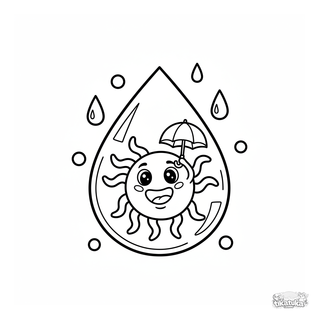 Página para colorir muito fácil para crianças de 2-3 anos: um microbio feliz com guarda-chuva flutua dentro de uma grande gota de chuva.