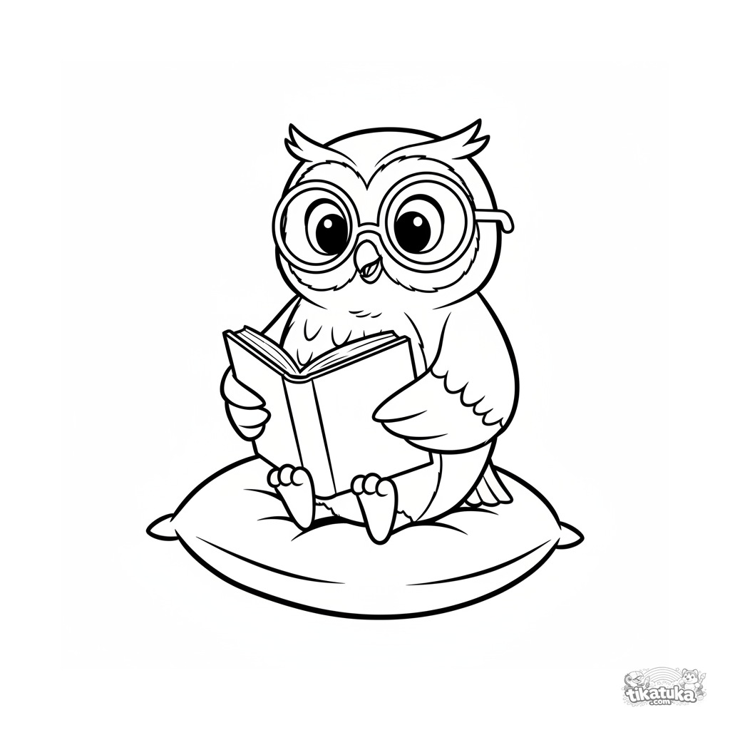 Página para colorir de desenho animado no estilo Disney para bebês: uma coruja com óculos e um livro em um travesseiro. Linhas fluidas, formas simples, para 2-3 anos.