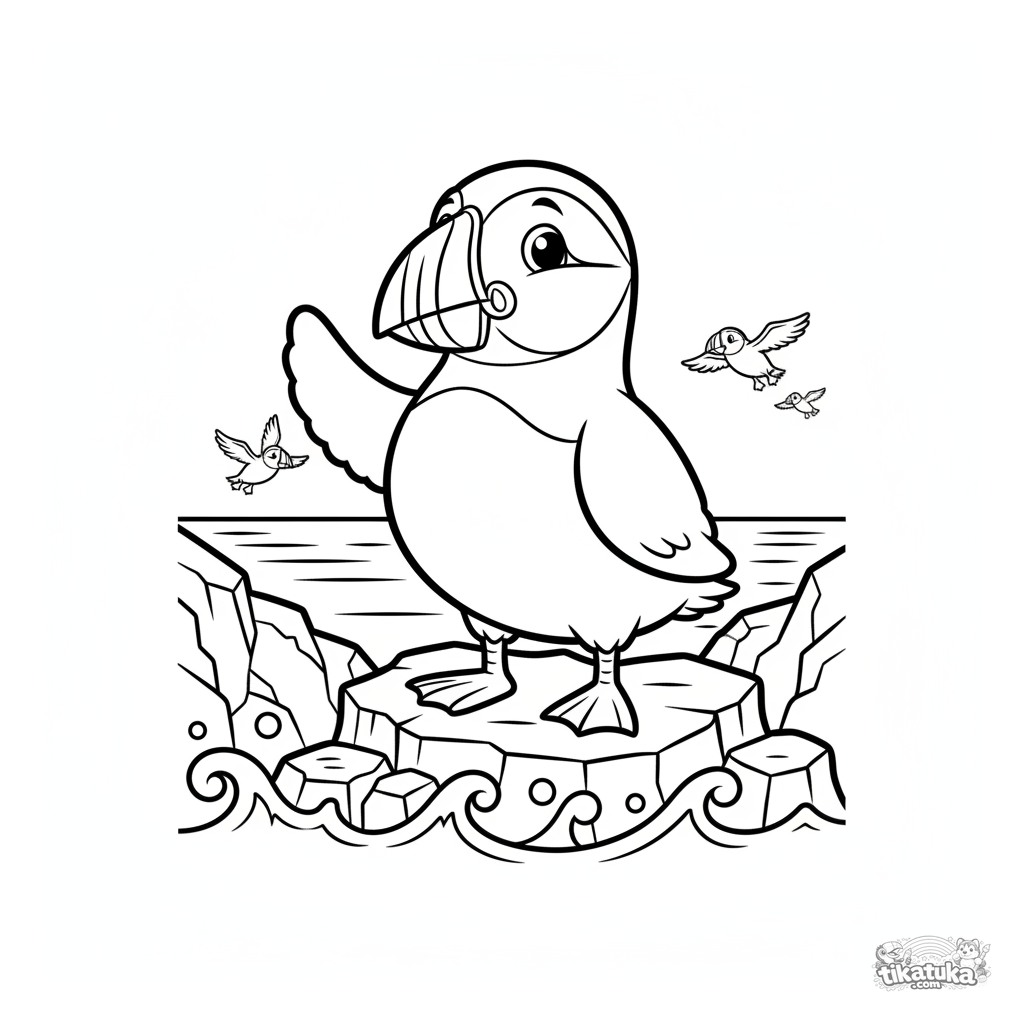 Página para colorir de um papagaio-do-mar de desenho animado num penhasco marinho. Para crianças de 4 a 6 anos.