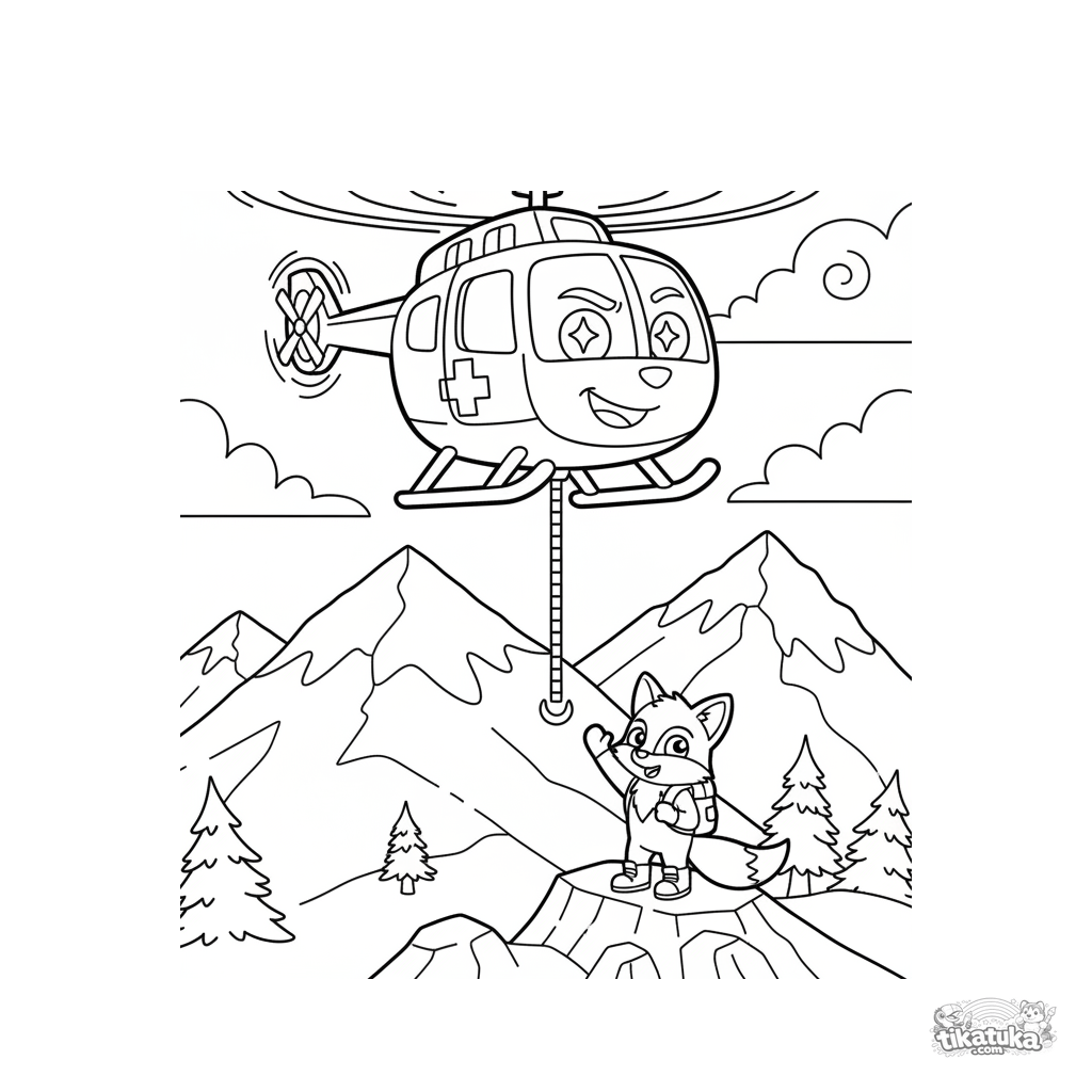 Página para colorir para 7-9 anos: um helicóptero de resgate pairando sobre uma montanha nevada. Cena dinâmica com contornos claros.