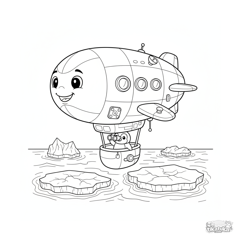 Página para colorir para pré-adolescentes de 7-9 anos: um dirigível de pesquisa amigável com um rosto sorridente paira sobre banquisas árticas. Um cientista pinguim observa com binóculos.
