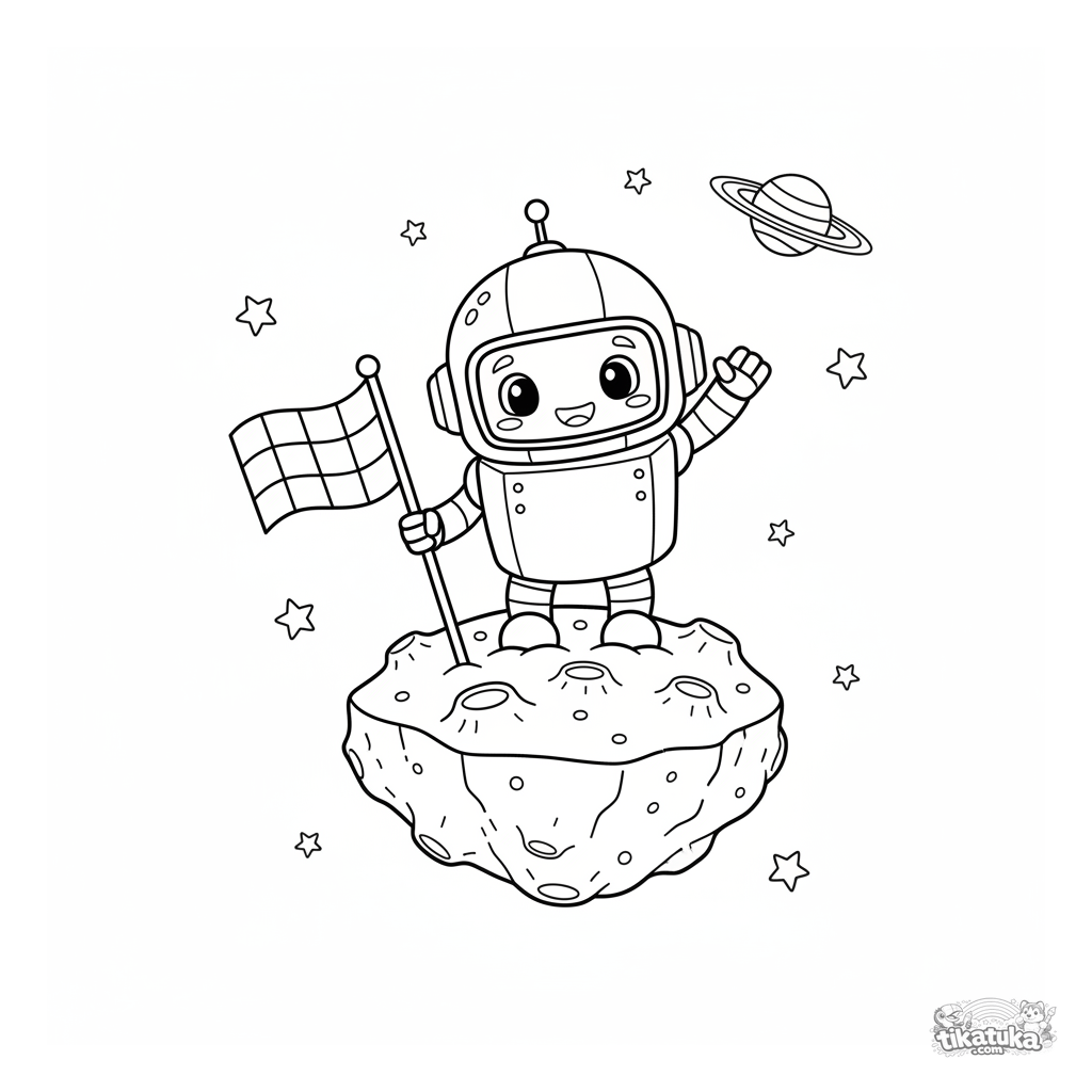 Página para colorir para crianças 5-7: um robô astronauta amigável planta uma bandeira em um asteroide no espaço.