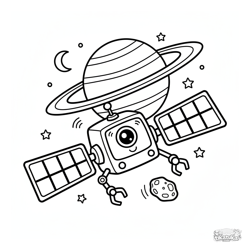 Página para colorir de uma sonda robótica amigável orbitando um grande planeta anelado no espaço. Para crianças de 2 a 5 anos.